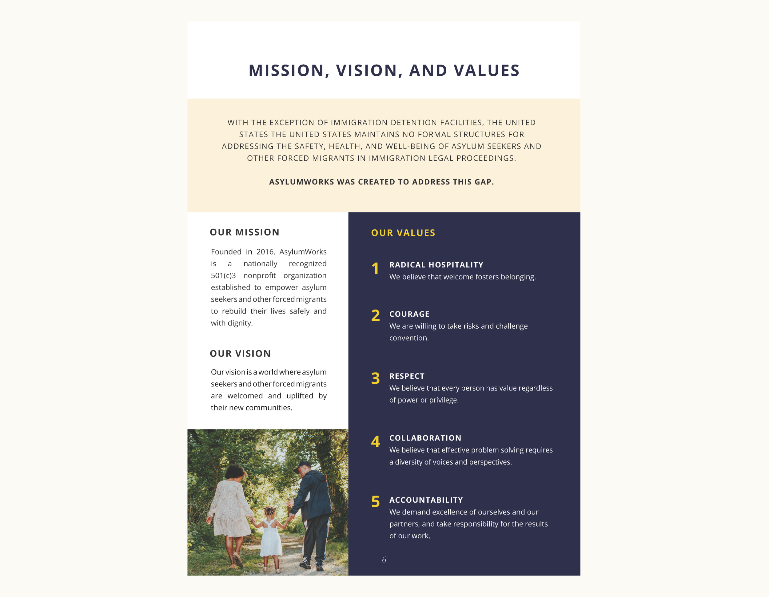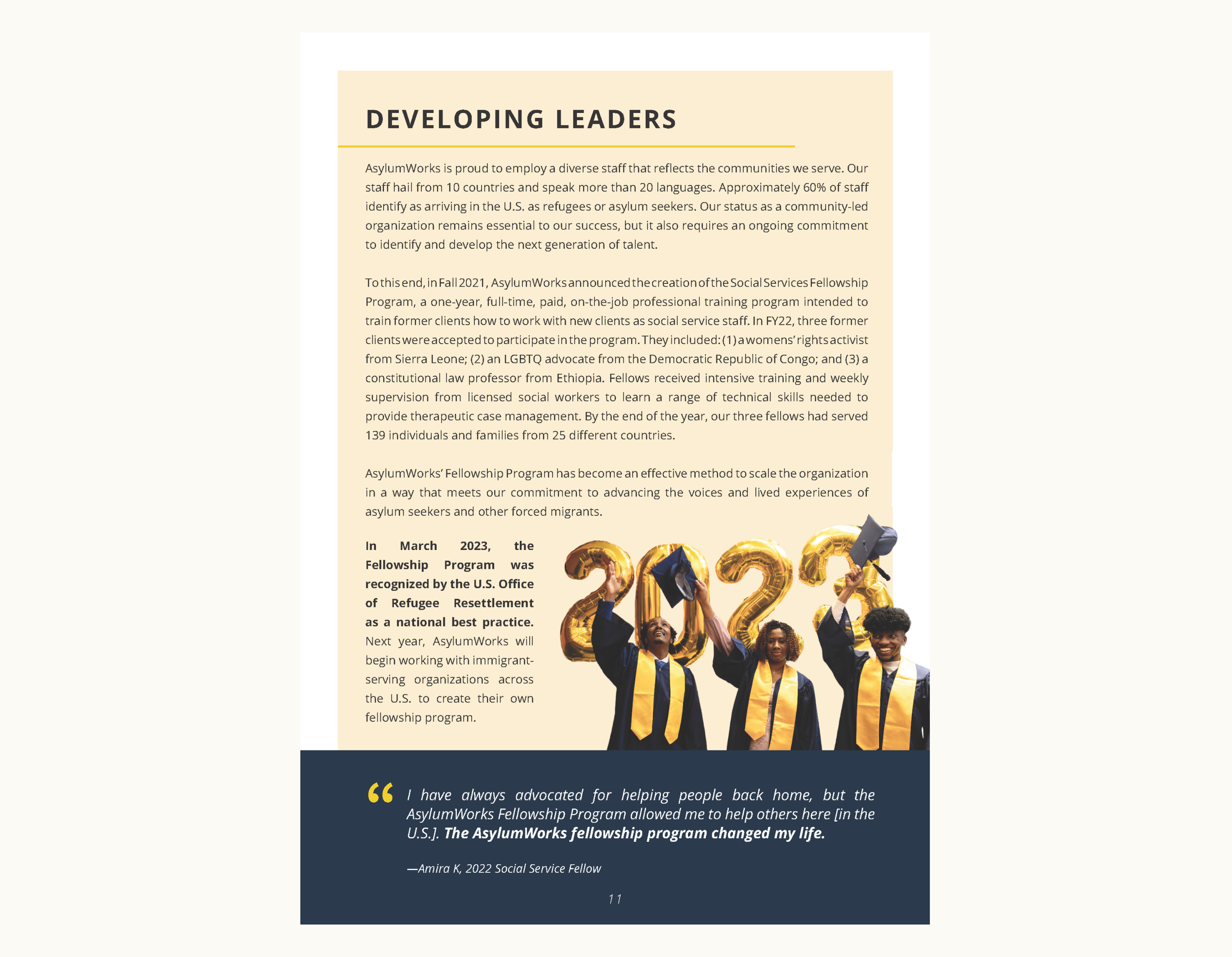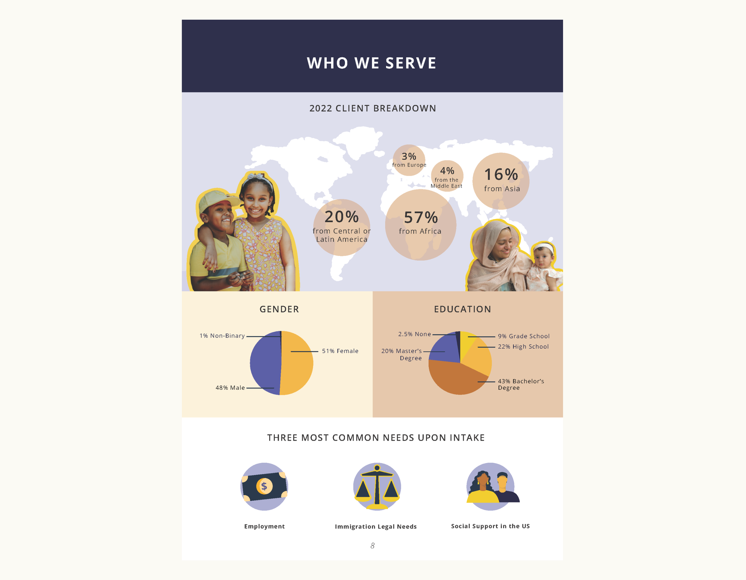 For the 2023 Impact Report, I developed a clean, engaging layout that wove together personal stories, organizational milestones, and digestible data. The result was a thoughtfully crafted publication that not only informed but inspired—showcasing AsylumWorks’ mission with clarity, empathy, and professionalism.